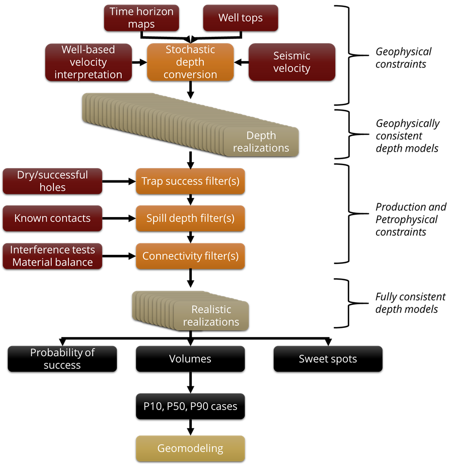 Depth realizations corresponding to successful (or failed) structural traps for a given set of targets (e.g., existing or planned wells) can automatically be identified and retained (or filtered out). This also allows assessing “success case” volumetrics.