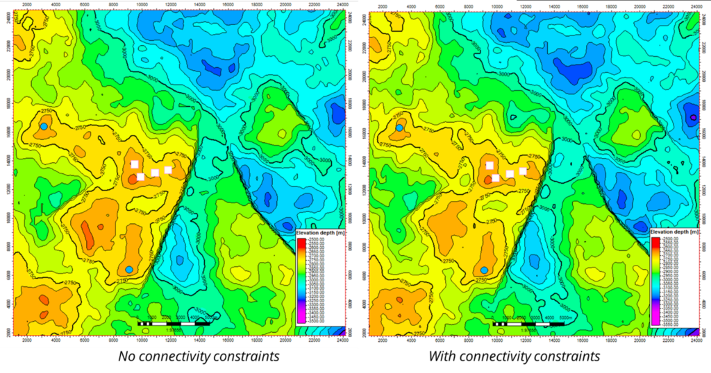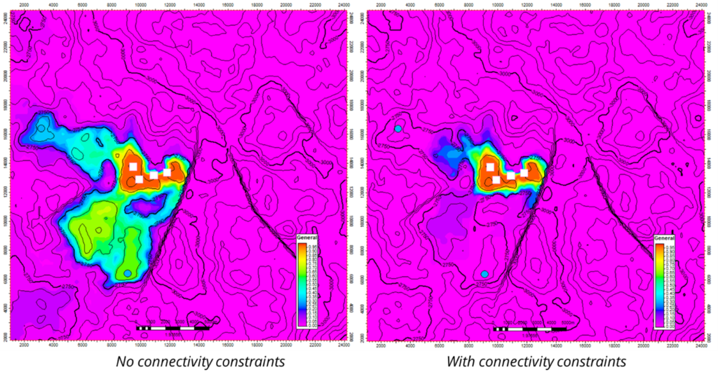 The connectivity between various hydrocarbon accumulations can also be quantified and used for filtering the list of stochastic depth realizations. This is useful when advanced data (tracer or interference tests, material balance analysis) is available to further constrain the depth conversion and structural modelling process. When such data is not available, the probability of connectivity between hydrocarbon accumulations can be estimated from the obtained surfaces.