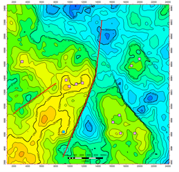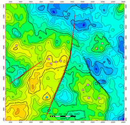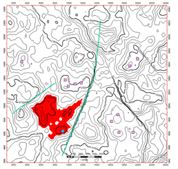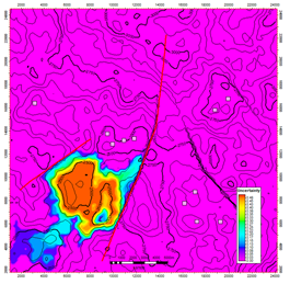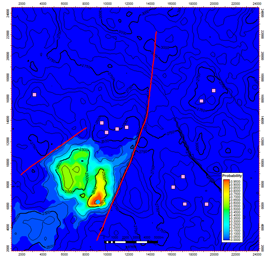 Udomore produces maps depicting the probability of presence of each prospect. Furthermore, Udomore can automatically report the probability that several accumulations are connected as part of the spill analysis.